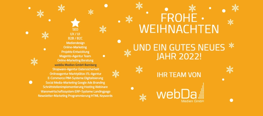 Wir von der webDa Medien GmbH wünschen allen Kunden und Kundinnen, Lesern und Leserinnen ein frohes Weihnachtsfest und ein gesundes neues Jahr! Vielen Dank für die gute und angenehme Zusammenarbeit! Wir freuen uns auf weitere gemeinsame, spannende Projekte im neuen Jahr 2023. Das webDa-Team verabschiedet sich vom